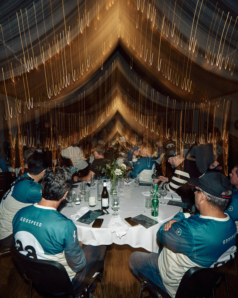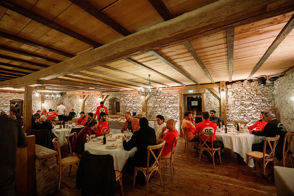 “All teams are sat outside on a massive medieval banquet table; whisky is being passed around, beers and red wine flowing. Everyone is tired but continue to swap stories about the amazing roads they got to tame that day.”